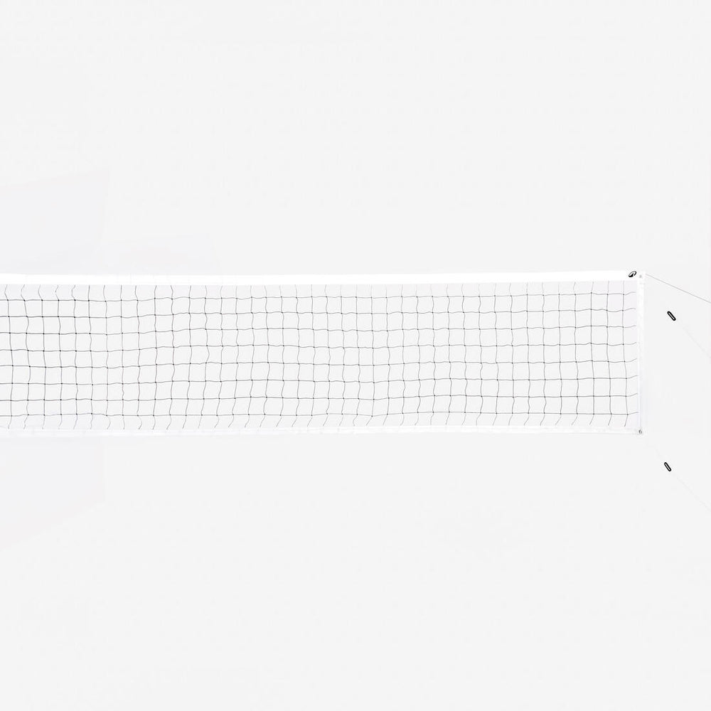 This volleyball net measures 9.5 m x 1 m and meets official standards thanks to its square mesh, white bands, covered steel cable across the top, and tensioner buckles.