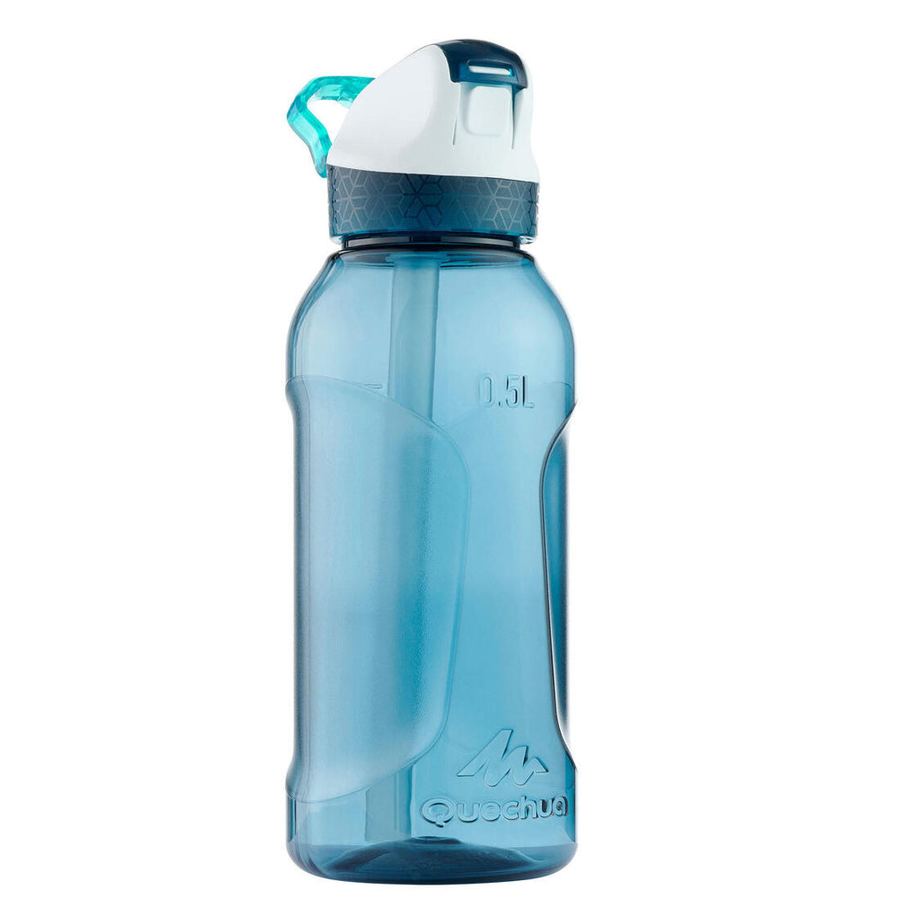 By using the straw, you drink by ""sucking"" while keeping your head upright.It is possible to drink by removing the inner straw as with a conventional water bottle. However, this may create strange noises (like a duck or dolphin, you choose) because of the intake of air upon contact with the water.The cap has a handle to make it easy to carry or for hanging on a backpack with a strap or carabiner.