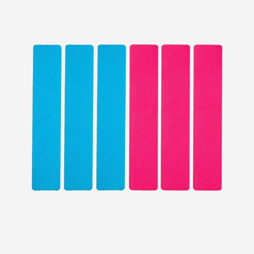 Kit of pre-cut kinesiology tape of the right length with rounded edges: For joints, tendons and muscles: 6 - 25 cm strips and 3 - 12.5 cm strips designed for three uses.