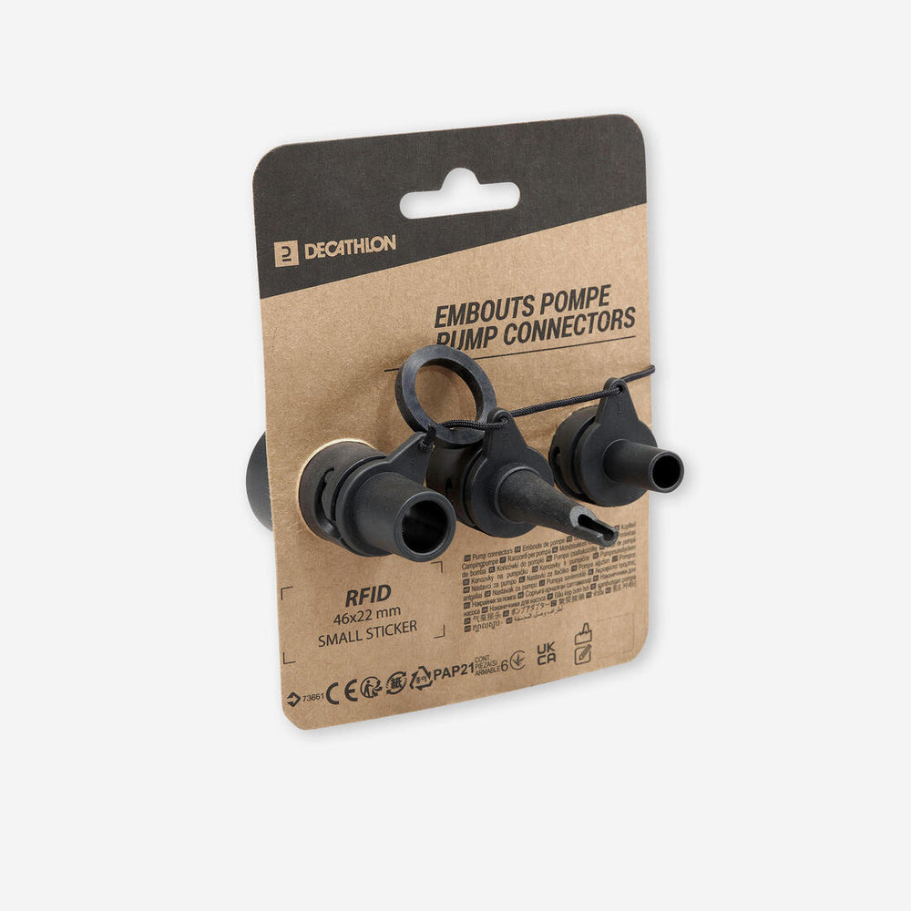 This pack contains the following: - A "Boston" nozzle for inflating tents, mattresses and low-pressure kayaks. - a “mini-Boston” tip to inflate kayak seats. - an adapter and tip to inflate certain kitesurf wings. - a thin tip for soft “duckbill” valves.