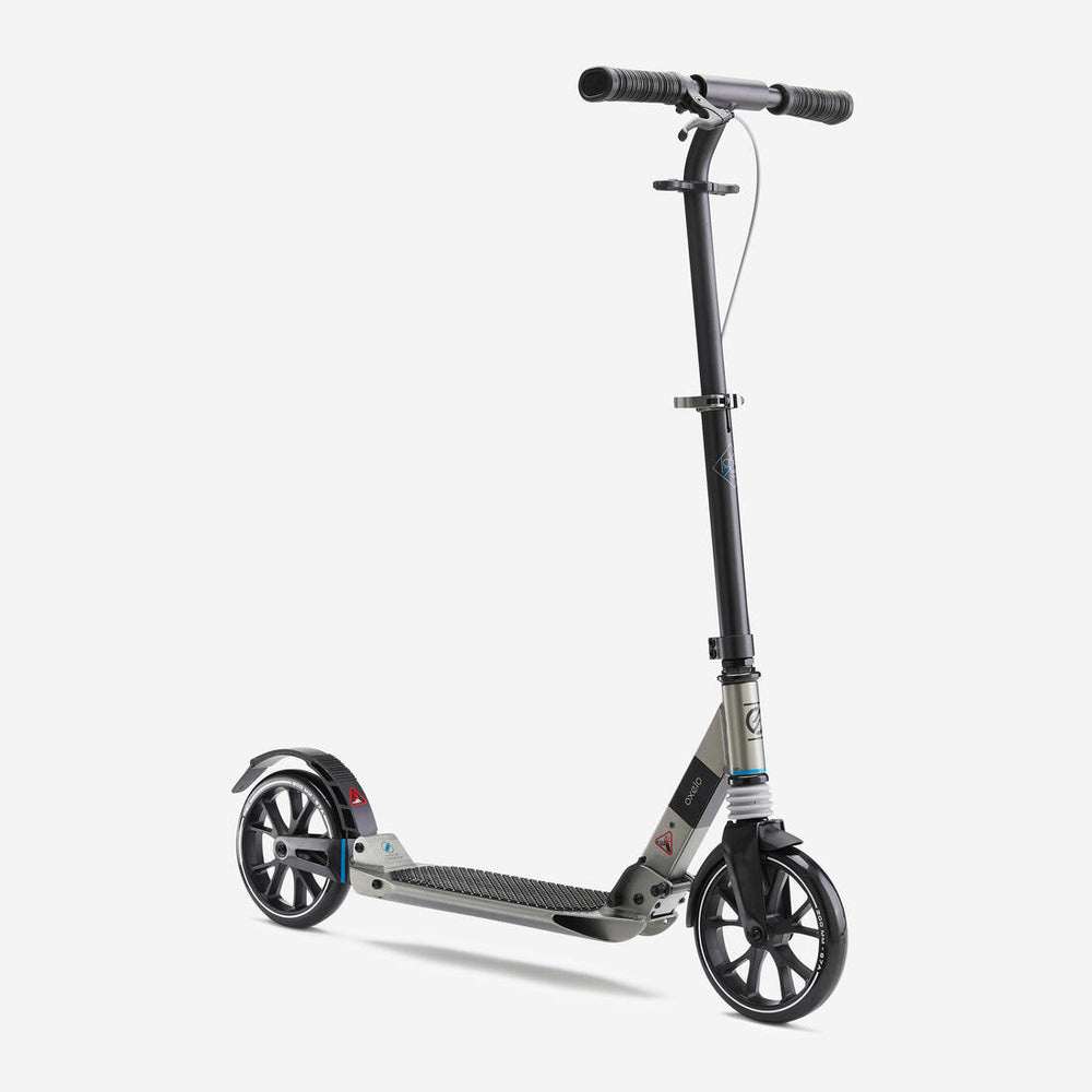 The Oxelo T7XL scooter comes with a brake on the handlebar and a second brake on the back wheel. This second brake comes in the form of a long mudguard that covers much of the wheel.